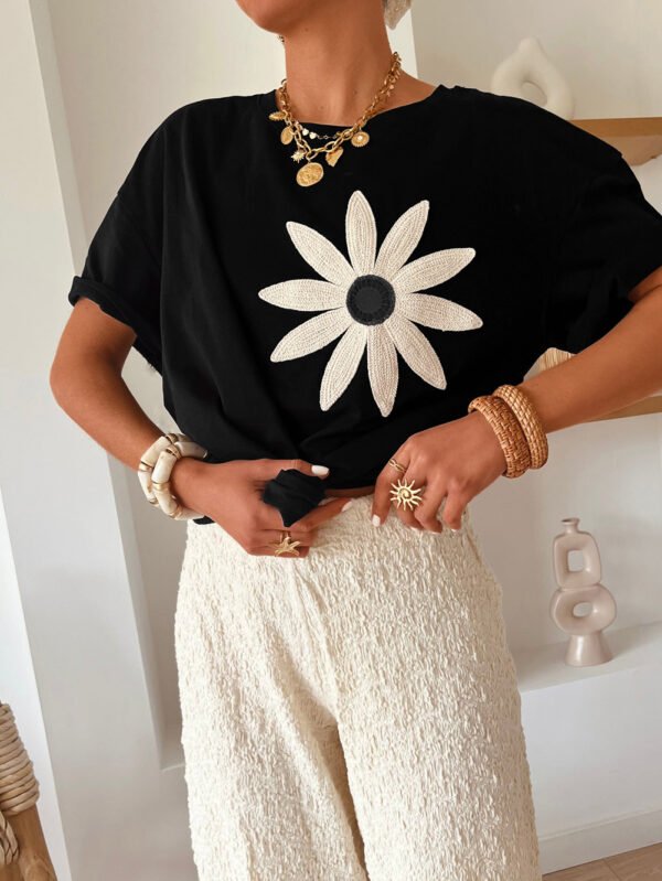 - Contrast bow applique adds dimensional elegance to this casual sweatshirt.
